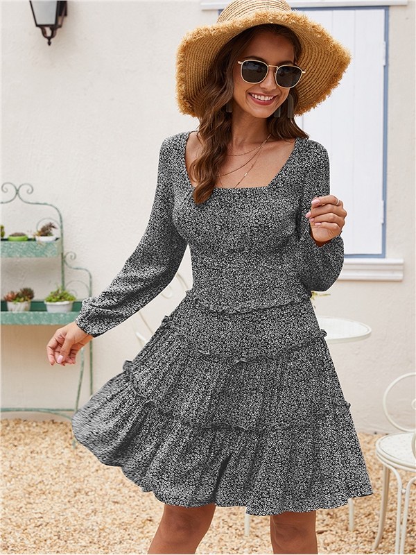 ✿ Features: Long Sleeve, Mid-Length, Smocking Details, Square Neck, High Waist, A Line Swing Dress, Pullover Dress.