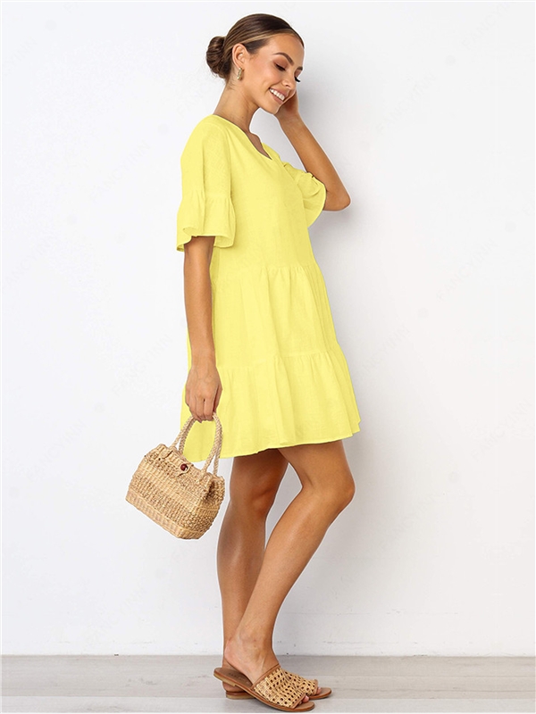 Women's Spring and Summer Solid Color V-neck Short-Sleeved All-match Dress